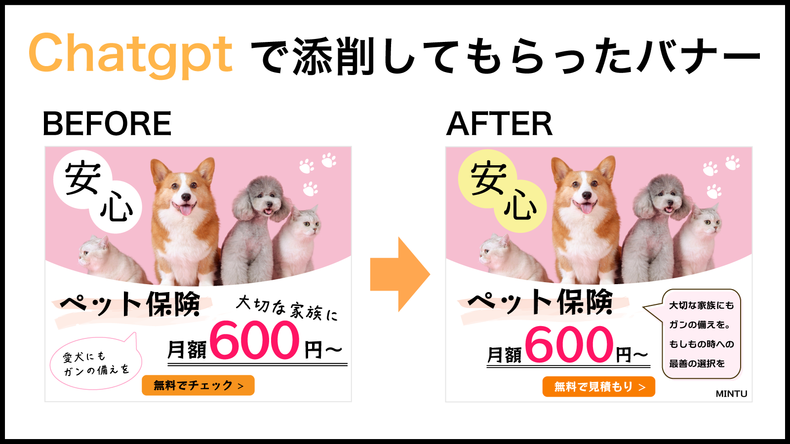現在、「ペット保険」と「大切な家族に」の間にやや間があり、文としてつながりにくい印象があります。💡 提案文例: